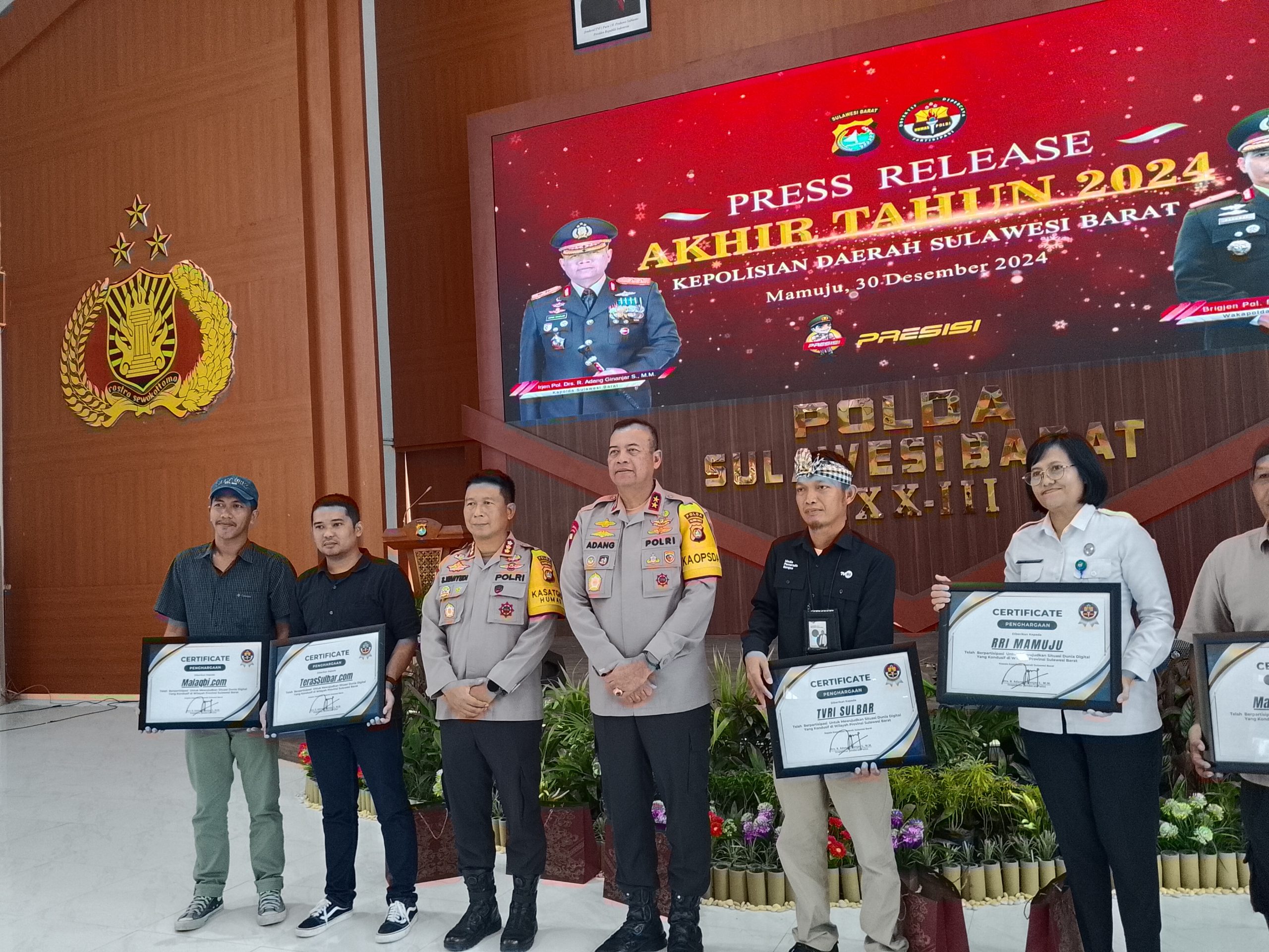 Beritaintelijennews.com, Polda Sulbar – Bidang Hubungan Masyarakat (Bid Humas) Polda Sulbar menggelar press release akhir tahun 2024, Senin (30/12/24) di Aula Marannu Polda Sulbar. Acara ini bertujuan untuk menyampaikan laporan kinerja Polda Sulbar sepanjang tahun 2024 mulai dari capaian pengungkapan kasus kriminal hingga prestasi.