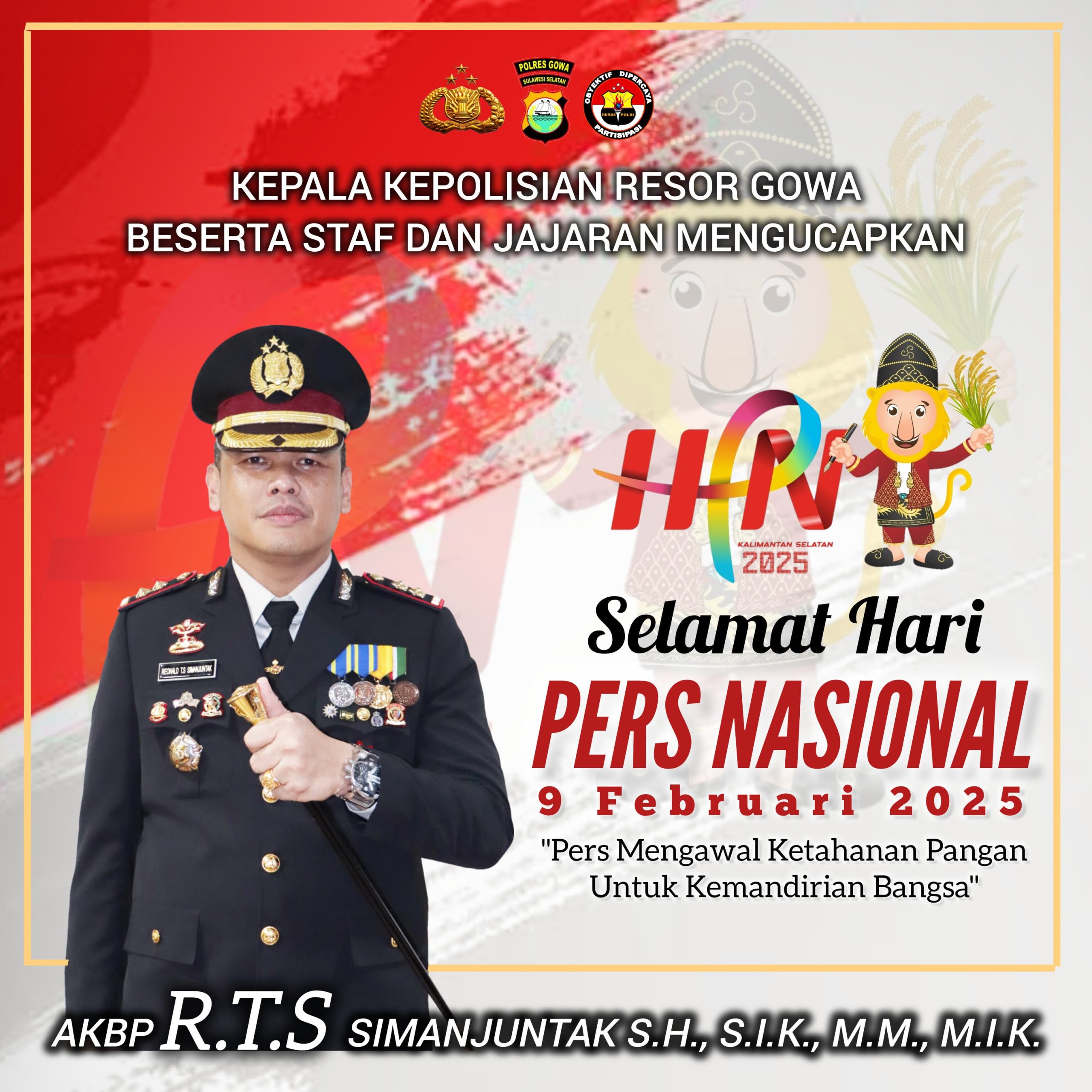 BeritaIntelijenNews.com—-Kapolres Gowa, AKBP R.T.S Simanjuntak, S.H., S.I.K., M.M., M.I.K., menyampaikan ucapan selamat memperingati Hari Pers Nasional (HPN) 2025, yang jatuh pada 9 Februari. Tahun ini, peringatan HPN mengusung tema “Pers Mengawal Ketahanan Pangan untuk Kemandirian Bangsa.”, Minggu (9/2/2025).