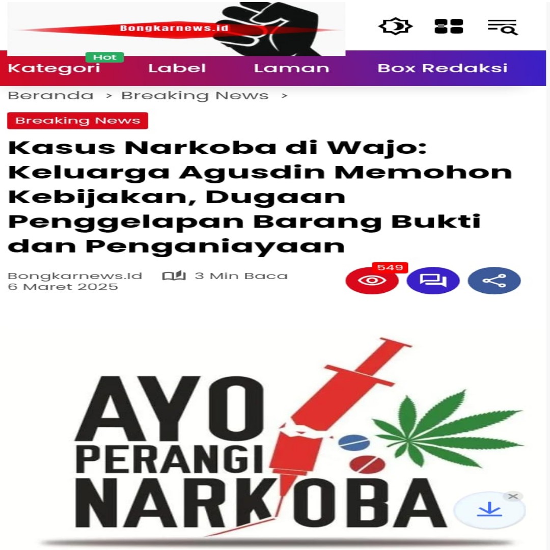 Kasus Narkoba di wajo tengah diselidiki terkait penangkapan penyalahgunaan narkoba yang melibatkan Agusdin alias Agu, warga Desa Ciromanie, Kecamatan Keera, Kabupaten Wajo. Penangkapan yang dilakukan oleh Tim 3 Dit Narkoba Polda Sulsel pada Selasa, 11 Februari 2025 pukul 17.00 WITA di Labawang ini menimbulkan kontroversi.