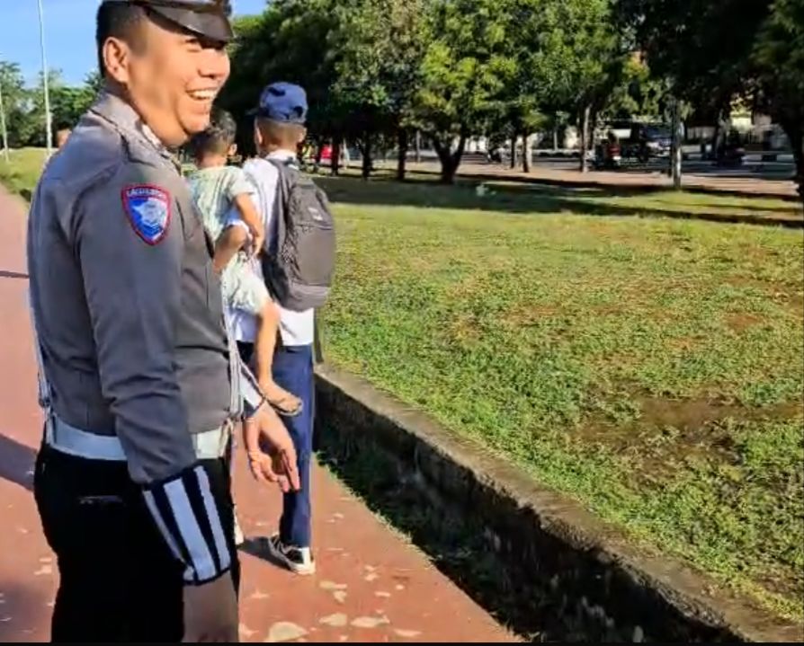 BeritaIntilejenNews.com—-Kepedulian dan pelayanan prima kembali ditunjukkan oleh personel Polres Gowa. Saat melaksanakan tugas pengamanan pagi (strong point) di sekitar Lapangan Syekh Yusuf Discovery, BRIPKA Fais, anggota Satuan Lalu Lintas Polres Gowa, membantu seorang ibu yang kehilangan anak laki-lakinya, Selasa (22/4/2025)..