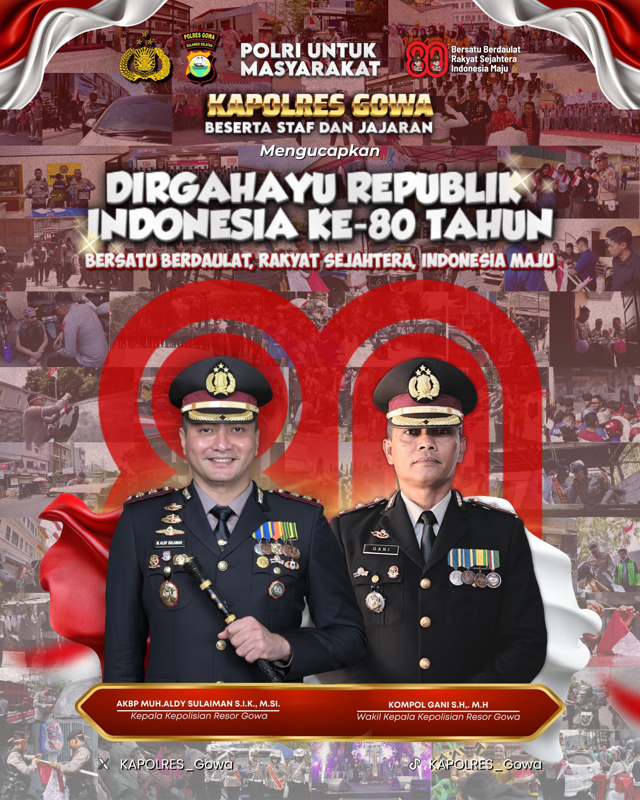 BeritaIntelijenNews.com—–Kapolres Gowa AKBP Muhammad Aldy Sulaiman, S.I.K., M.Si, bersama seluruh staf dan jajaran Polres Gowa, mengucapkan Dirgahayu Republik Indonesia ke-80 Tahun, Minggu (17/8/2025).