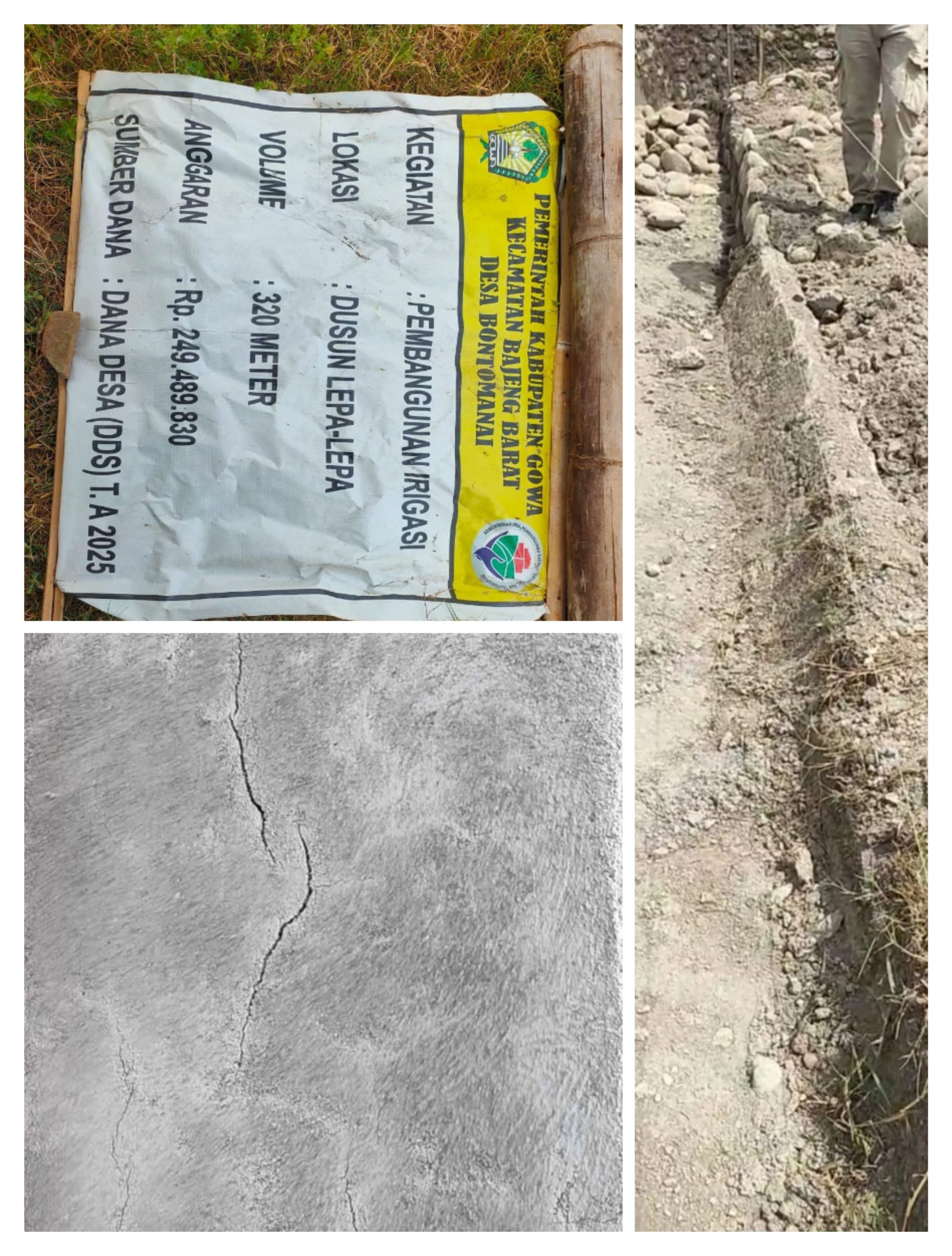 BeritaIntelijenNews.com—-Gowa – Pekerjaan pembangunan saluran irigasi di Dusun Lepa-Lepa, Desa Bontomanai, Kecamatan Bajeng Barat, Kabupaten Gowa, menjadi sorotan setelah tim media melakukan penelusuran lapangan pada tangan 23/12/2025 dan menemukan sejumlah indikasi pekerjaan yang diduga tidak sesuai standar mutu konstruksi.