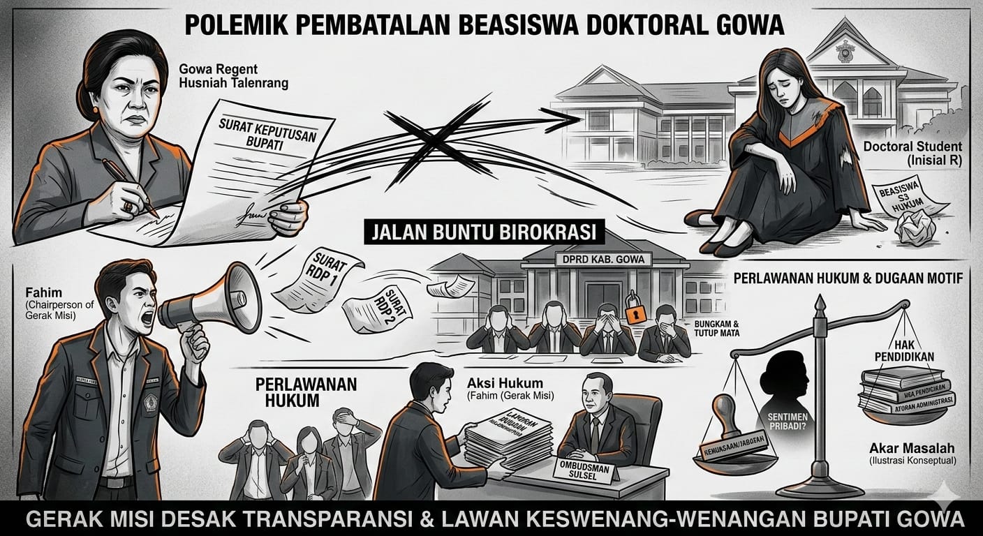 Gowa, 1 Maret 2026, keputusan bupati Gowa terkait pembatalan beasiswa doktoral S3 mengalami polemik yang panjang hingga saat ini, pembatalan beasiswa tersebut bermula saat bupatin Gowa Husniah talenrang mengeluarkan surat pernyataan pertanggal 29 Desember 2025 dengan perihal pembatalan pemberian beasiswa daerah kepada mahasiswi doktoral hukum yang sedang menjalani studi di universitas Hasanudin.
